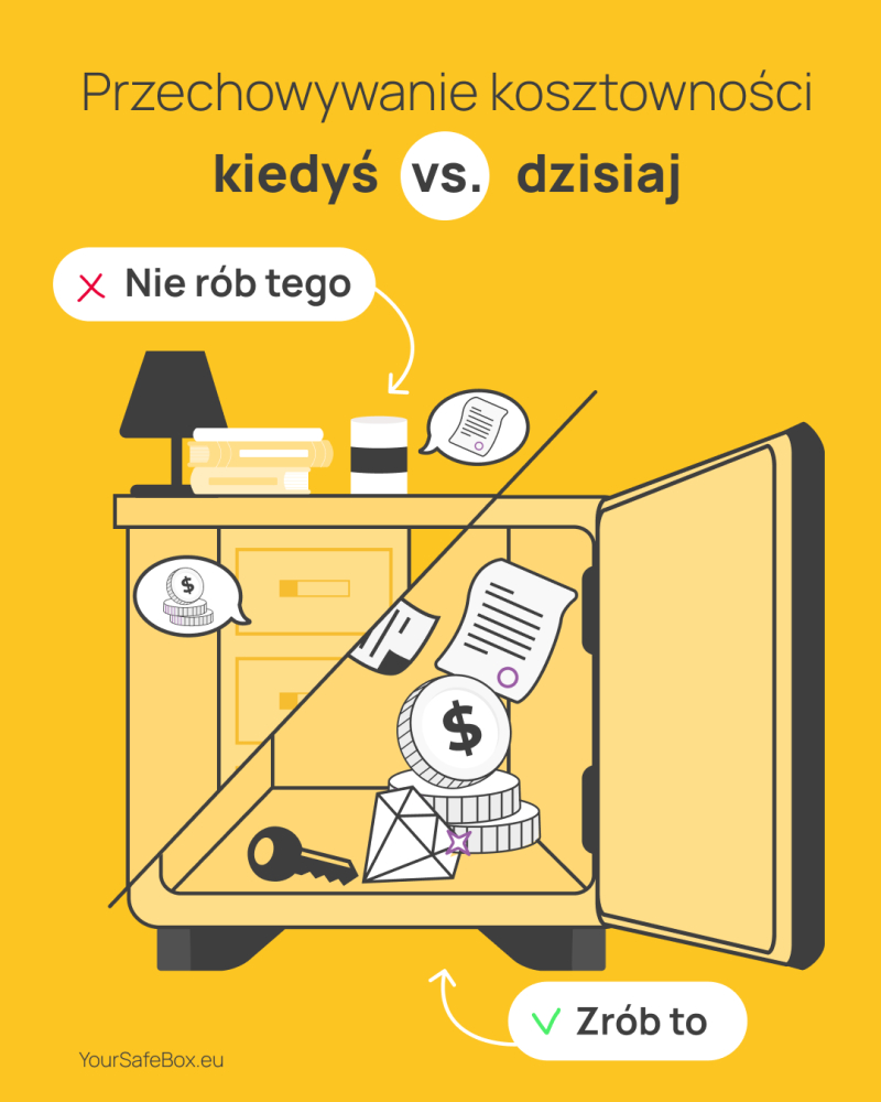 YourSafeBox to nowoczesna usługa przechowywania wartościowych przedmiotów, oparta na czterech filarach: dyskrecji, poufności, wygodzie i ochronie. Oferujemy automatyczne, samoobsługowe skrytki depozytowe dostępne w pięciu rozmiarach, które umożliwiają przechowywanie dokumentów, złota, biżuterii, gotówki, testamentów i innych kosztowności. Proces rezerwacji odbywa się online, bez konieczności kontaktu z personelem, zapewniając pełną anonimowość i oszczędność czasu.